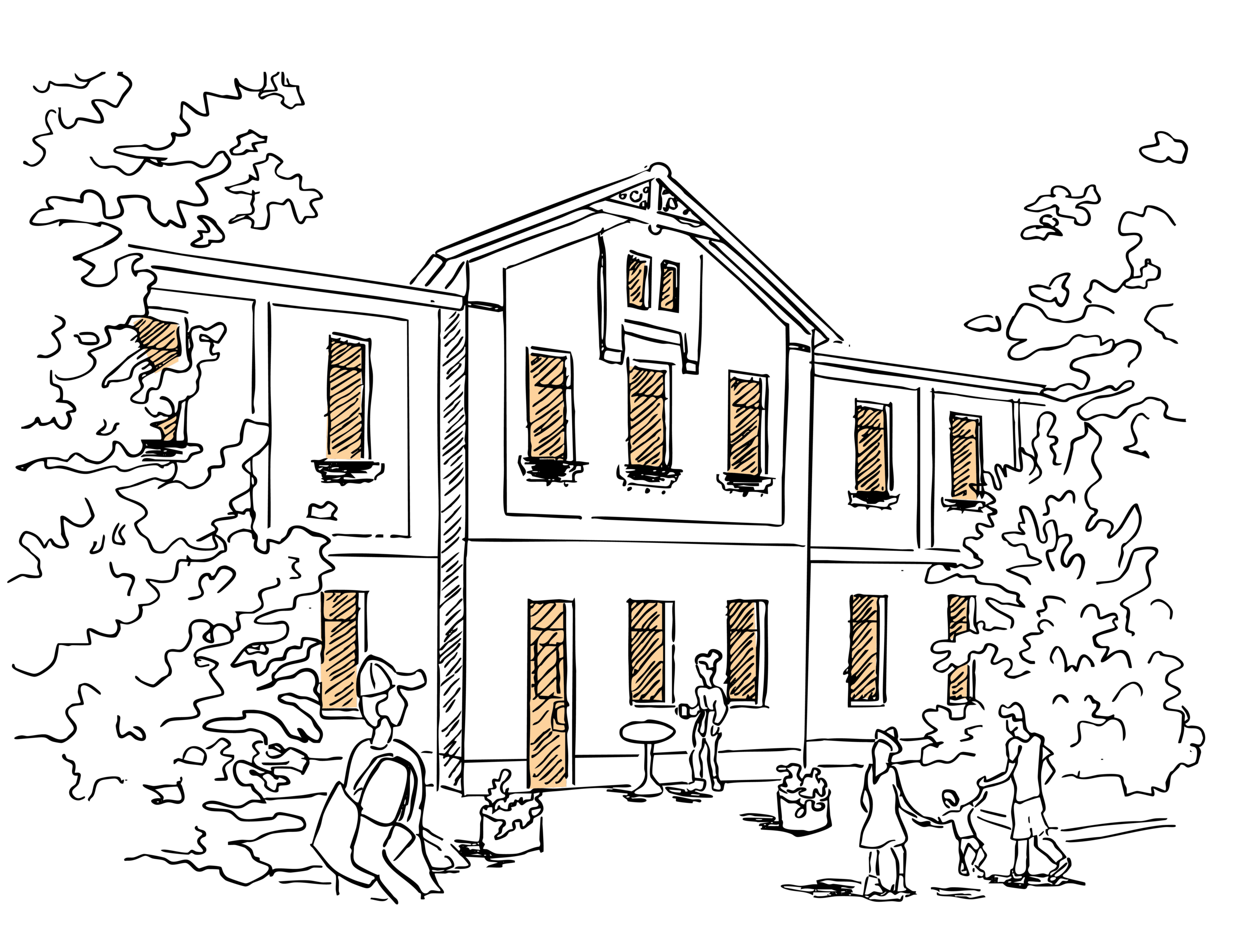 Wir sitzen auf der Terrasse eines lebendigen, grünen Hofes. Vögel, Insekten und Menschen aller Generationen kommen hier zusammen – um sich auszutauschen, zu lernen, zu forschen, zu gestalten, zu spielen, zu singen, zu tanzen, zu reparieren, zu kochen, gemeinsam zu essen und neue, wie alte Fähigkeiten zu teilen.